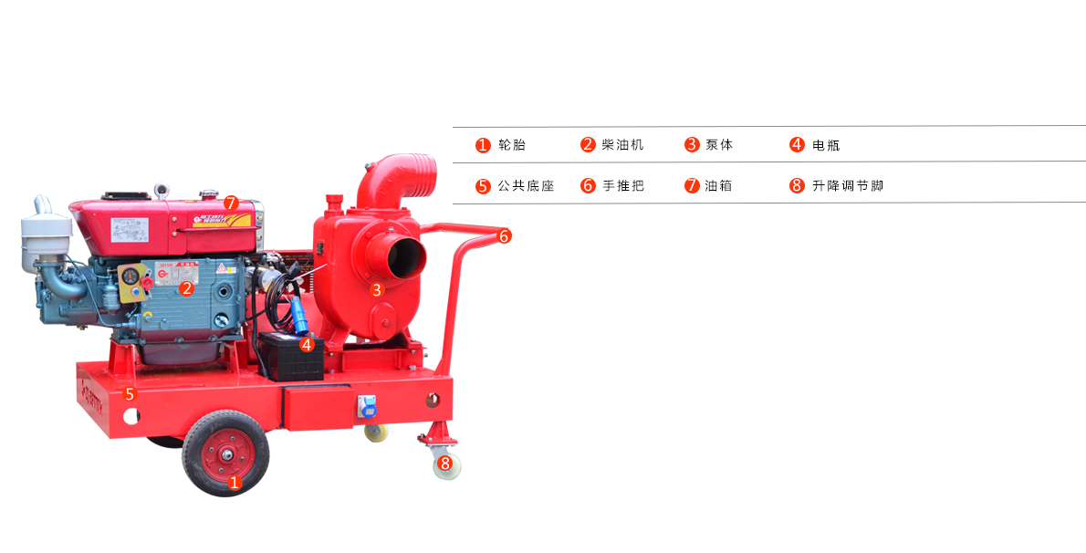 1.手推式強自吸移動泵車主要由真空輔助裝置、柴油機動力包、柴油機專用油箱、泵傳動系統(tǒng)、設(shè)備底座、自吸泵總成、防雨設(shè)施、起動裝置、起動電源裝置、進水管總成、出水管總成、二輪移動拖車系統(tǒng)、快速起吊裝置等組成。