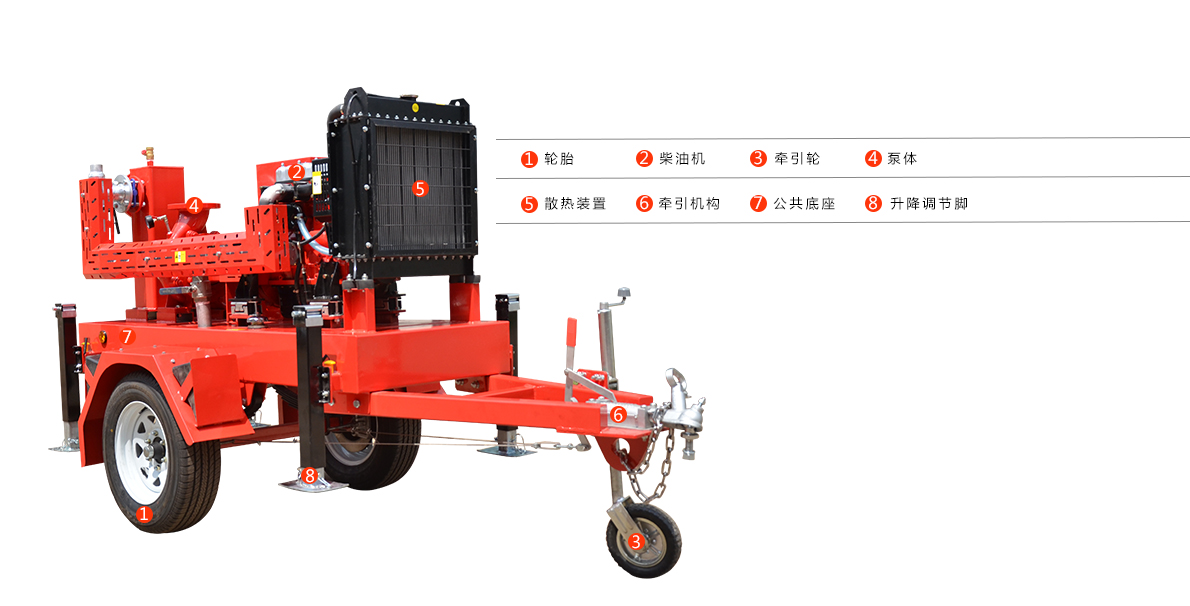 2.單級式移動泵車主要由真空輔助裝置、柴油機動力包、柴油機專用油箱、泵傳動系統(tǒng)、設(shè)備底座、自吸泵總成、防雨設(shè)施、起動裝置、起動電源裝置、進(jìn)水管總成、出水管總成、二輪移動拖車系統(tǒng)、快速起吊裝置等組成。